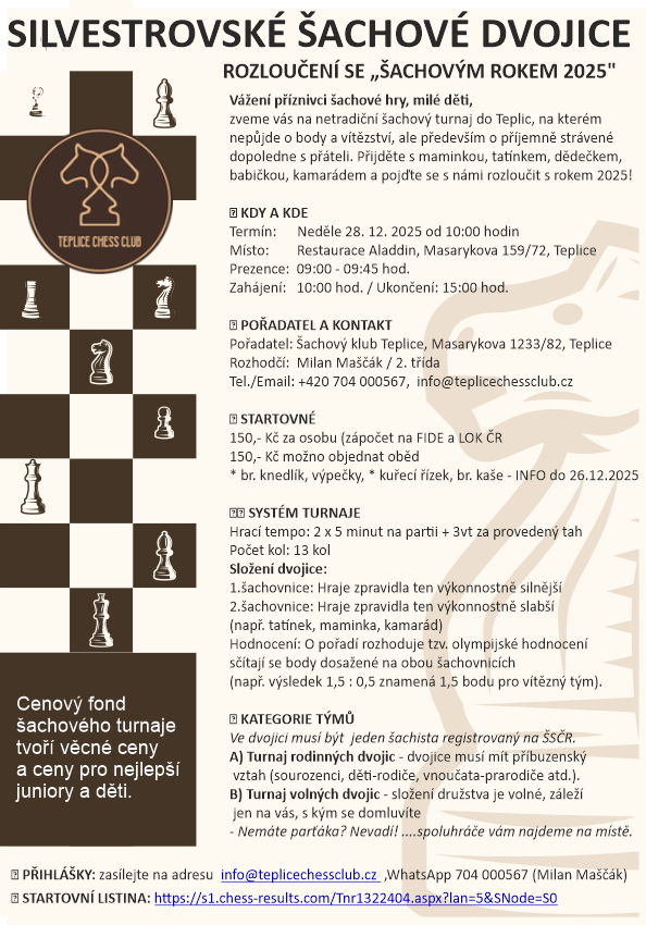 Vážení příznivci šachu, rodiče, junioři a milé děti, nejprve vám přeji klidné prožití svátečních dnů. Dovolte mi, abych Vás jménem Teplice Chess Club pozval na BLITZ turnaj šachových dvojic, která se uskuteční tuto neděli 28.12.2026 od 10:00 hodin v salónku Restaurace Aladdin v Teplicích. Přijďte se s námi společně rozloučit s rokem 2025. Jste všichni srdečně zváni. Více informací naleznete v přiloženém letáku. V případě objednání oběda nás kontaktujte nejpozději do zítra.